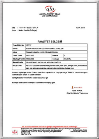 Vizyon Cam balkon 11.03.2003 yılından bu yana ticaret odasına kayıtlıdır.